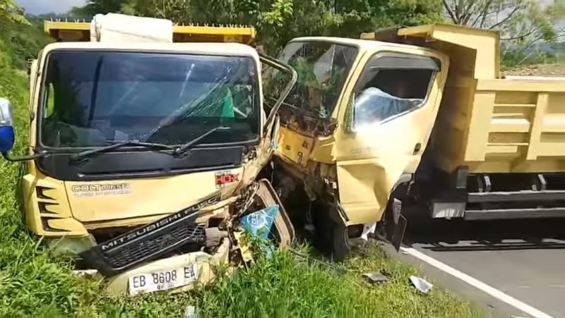 Kondisi itu menyebabkan kedua dump truk tidak memiliki cukup waktu untuk menghindar, sehingga benturan keras pun terjadi di badan jalan.